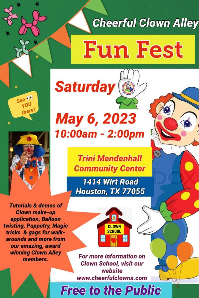 Join us for demonstrations on clown makeup, balloon twisting, puppetry, magic and props. Free event to introduce the art of clowning . Walk through stations with demonstrations in clown make up and costuming, balloon twisting, magic, juggling, puppetry, gags and props. Learn about our annual clown school and membership to our local organization in Houston. The event will be located at Trini Mendenhall Community Center, 1414 Wirt Rd, Houston, TX 77252. 10am-2pm