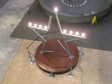 The beautiful Menorah was designed especially for the Galleria. It is a handcrafted masterpiece. Standing 12 feet high, it gracefully extends upwards in the shape of the famous Magen Shlomo – Shield of Solomon (The Lone Star). Local artist Isaac Cohen was commissioned to create and produce this magnificent work entirely out of brilliant steel materials.